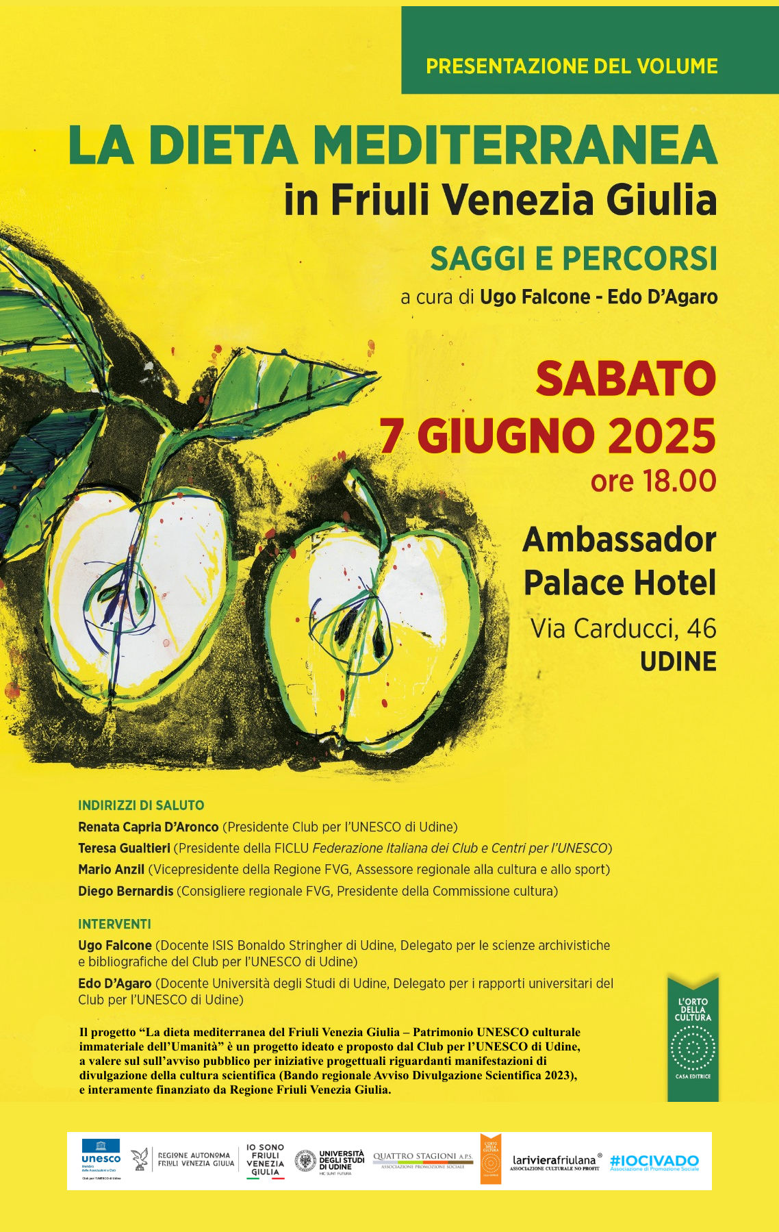 SABATO 7 GIUGNO 2025 – alle ore 18.00, in Saletta Chiara, verrà presentata in pubblicazione “La Dieta Mediterranea in Friuli Venezia Giulia. Saggi e percorsi”. Progetto la “Dieta Mediterranea del Friuli Venezia Giulia” (Bando Regionale “Avviso Divulgazione Scientifica 2023”).